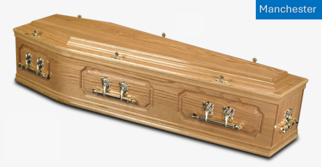 with scupltured panelled sides and raised lid. This coffin is fitted with gold bar casket handles, engraved nameplate and required religious fittings. Suitable for burial or