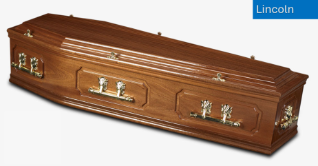 sides and raised lid. This coffin is fitted with gold bar casket handles, engraved nameplate and required religious fittings. Suitable for burial or cremation