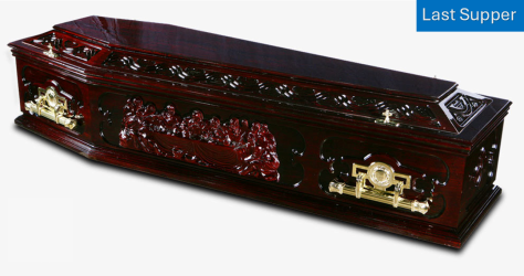 rich mahogany coffin with a piano high gloss finish. It features a carving of "The Last Supper", a raised lid and gold bar casket handles. This coffin is fitted with required