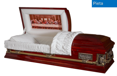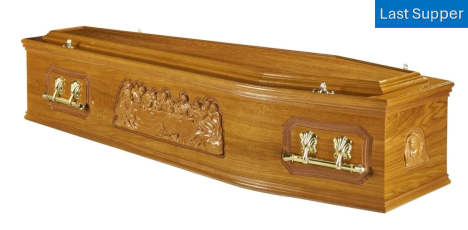 light mahogany. It features a side moulding of "The Last Supper", a raised lid and gold bar casket handles. This coffin is fitted with required religious fittings. Suitable for burial or